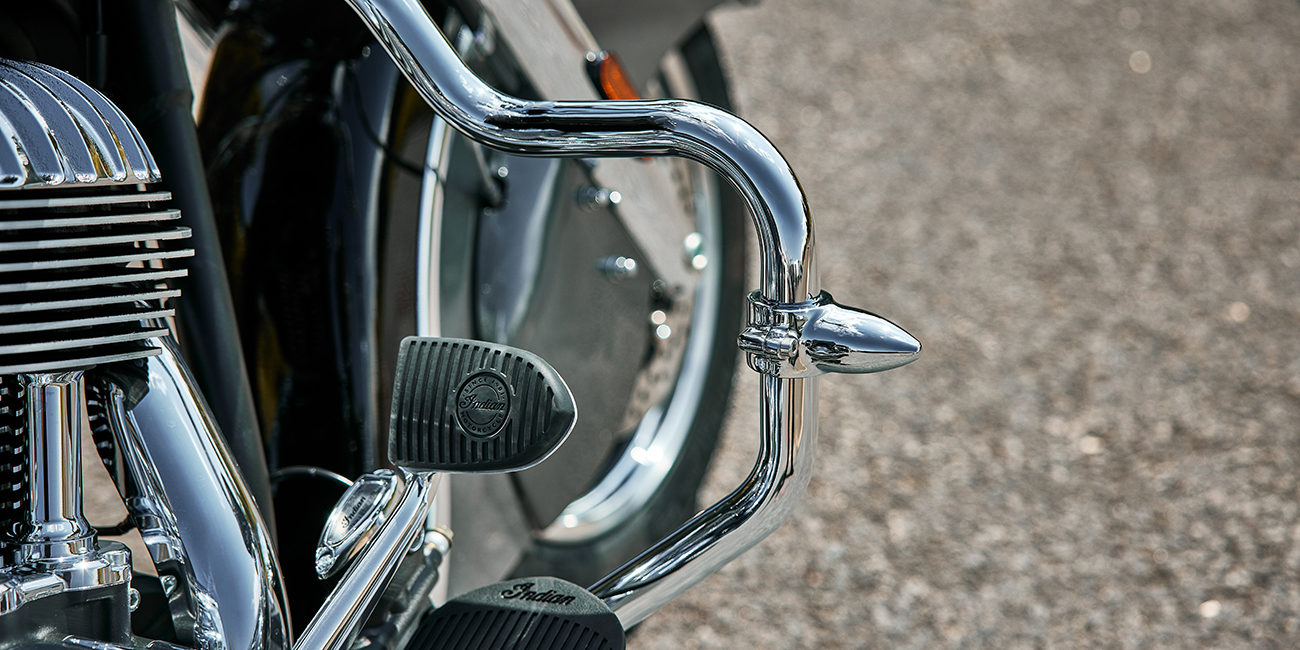 Pare-brise à attache rapide ; selle en vinyle ; sacoches rigides à verrouillage à distance, barres d'autoroute ; surveillance de la pression des pneus ; barre lumineuse ; ABS ; régulateur de vitesse ; allumage sans clé ; badge Indian® Script Tank